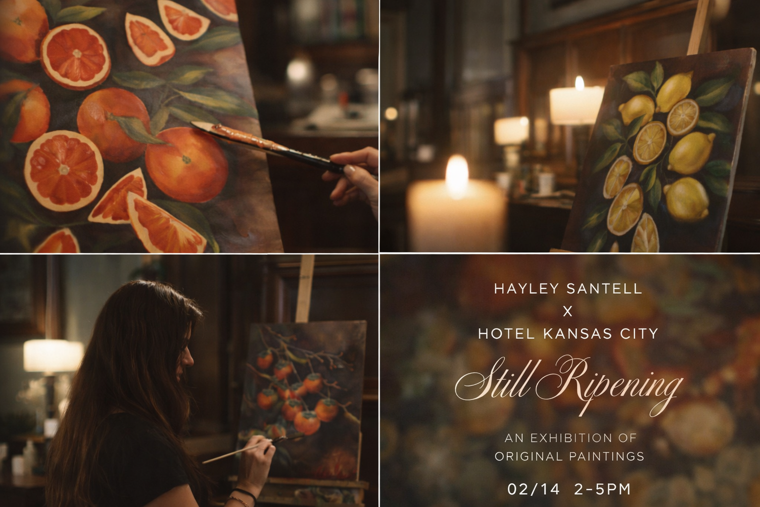 Working on a new collection live in the hotel every Thurs and Fri - STILL RIPENING - of original paintings inspired by fruit that thrives in the cold dark winter season. This collection will go up in a 1-night exhibition at Hotel Kansas City on Valentine's Day from 2-5pm! And, any remaining available pieces will be up for sale on my website. Email me at hello@hayleysantell.com to inquire about pre-ordering a piece from this collection before they're on public exhibition.