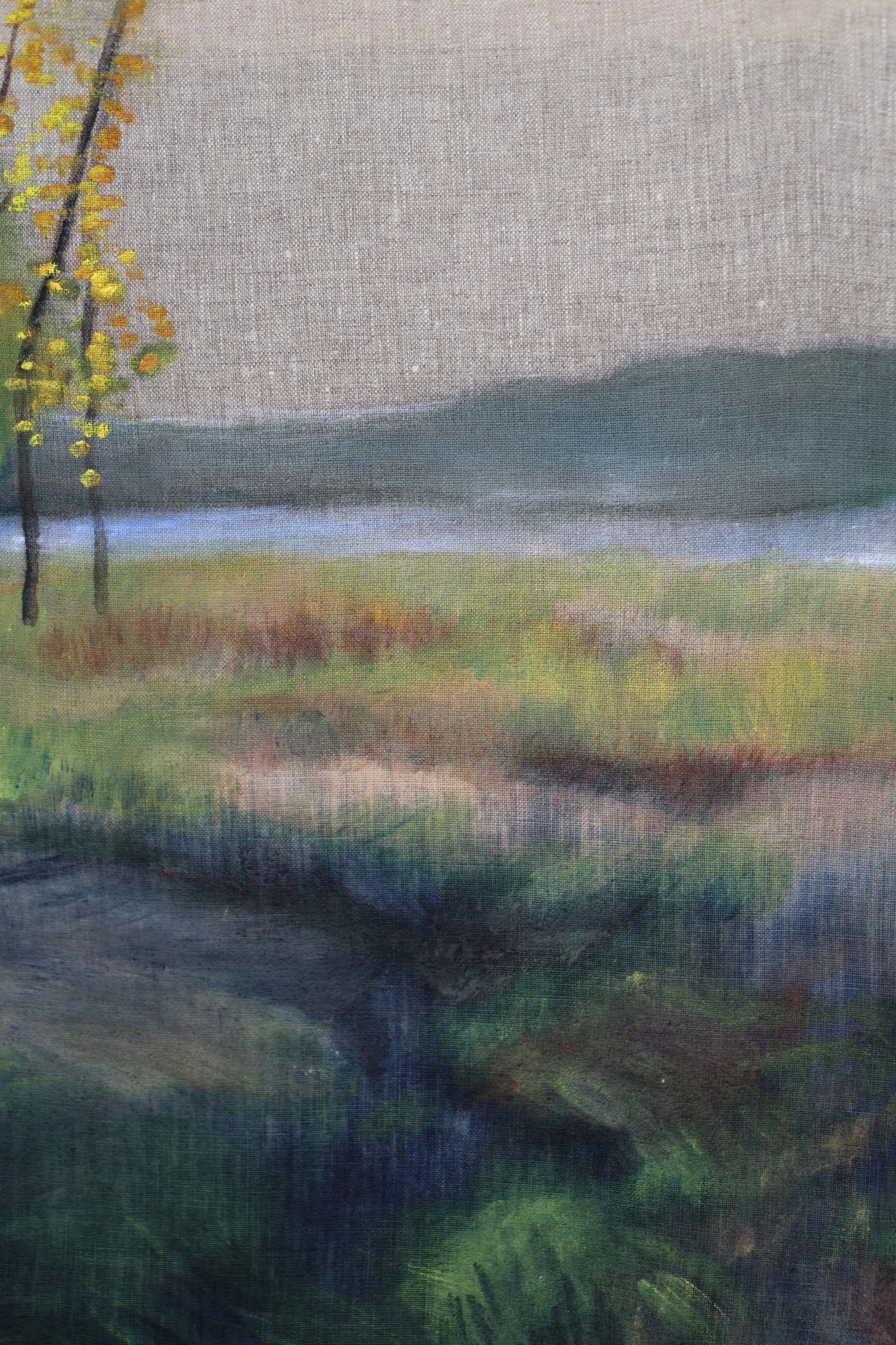 Hand made toxic-free oils on raw linen dyed in natural indigo dye, stretched on wooden bars