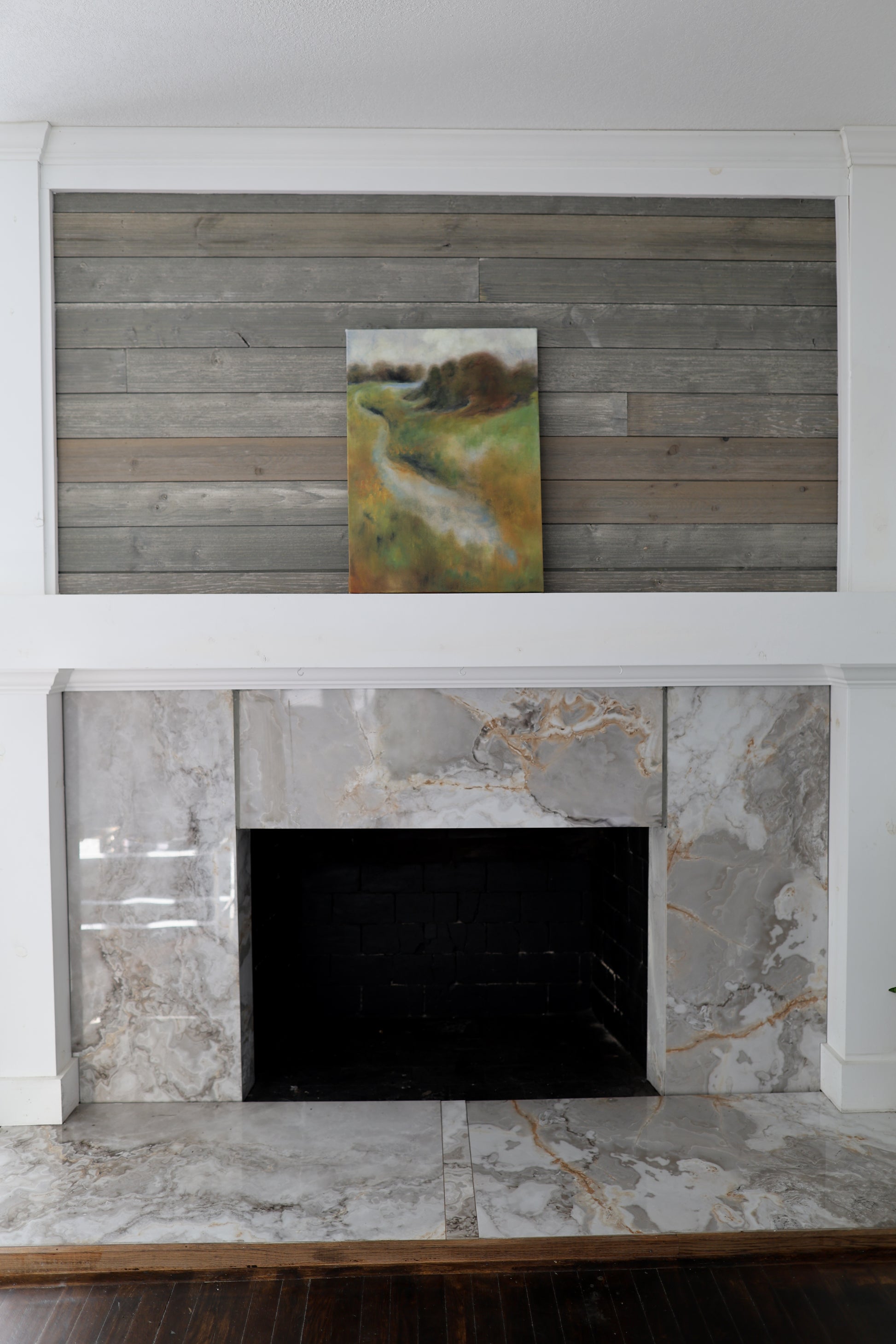 Blurring the lines with my past career in ethical fashion, I used plant dyes to dye the cotton and linen canvas' before stretching onto wooden bars. Portions of the sky and river aren’t painted—they’re revealed. I intentionally left portions of the naturally dyed canvas—soft indigos and earthy greens—exposed as negative space, allowing the sky and river to emerge from the material itself. Instead of painting over those areas, I let the fabric and plant dyes speak to form the landscape.