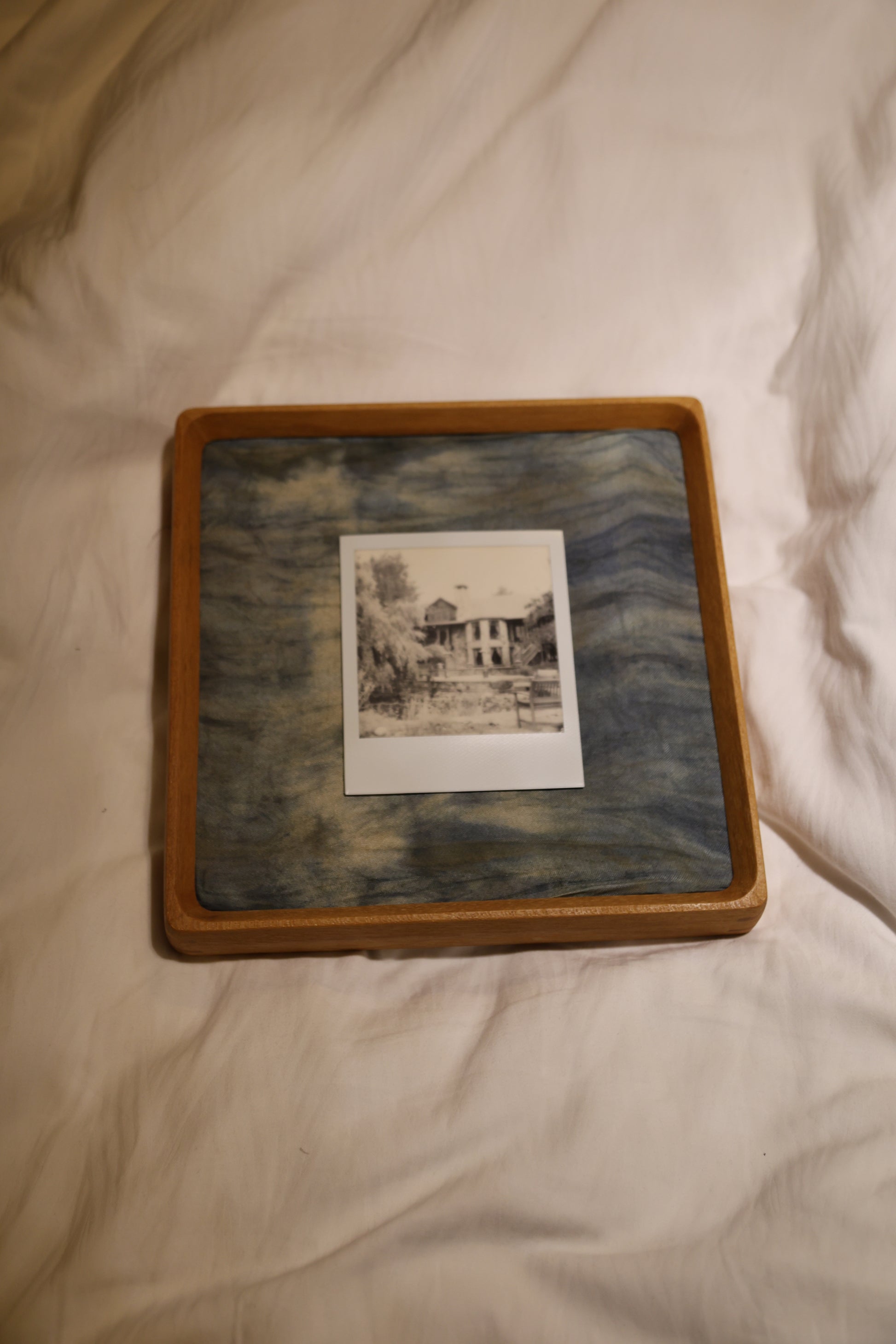 Polaroid photograph matted on cruelty-free silk, hand-dyed in natural indigo and marigold in a solid teak wood frame. Can hang or stand.